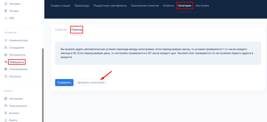 Чтобы клиенты автоматически переходили из категории в категорию настройте автоматический переход. В меню Лояльность, вкладка Категории перейдите в раздел Переход и нажмите кнопку Добавить категорию.