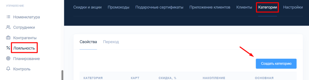 Создать категории клиентов можно в меню Лояльность, во вкладке Категории: