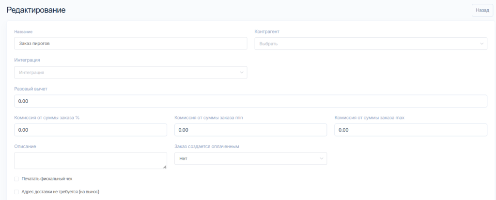 Отчисления в сторону агрегатора. Заполняется по условиям договора с сервисом доставки (не обязательно для заполнения).