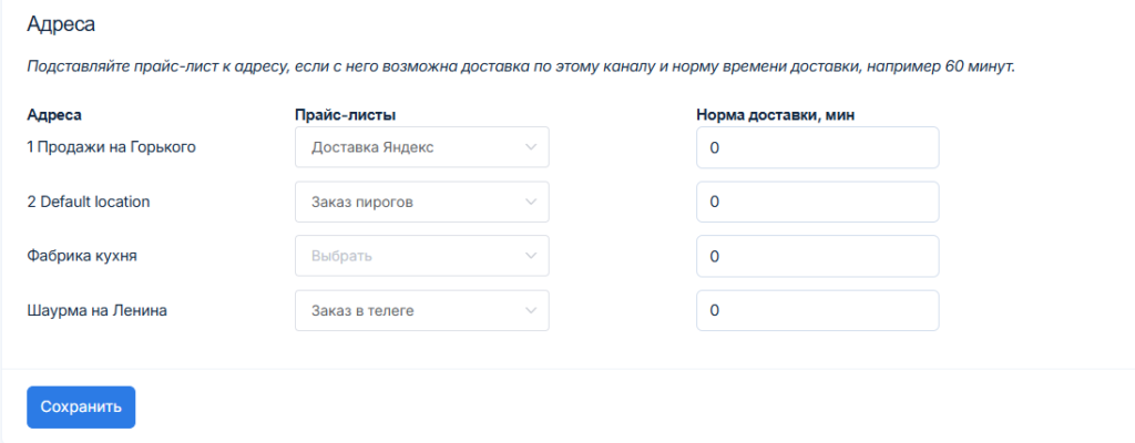 К каждому адресу необходимо привязать прайс-лист. Можно ограничить количество торговых точек, которые будут принимать и отдавать заказы курьерам — без привязки прайс-листа к адресу, кассир не сможет оформить заказ на доставку.
