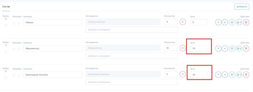 Далее добавляем варианты дополнительных ингредиентов так же, как делали это с комбинациями через кнопку Добавить. На каждый вариант добавки можно назначить цену, которая будет суммироваться с ценой напитка или изделия.