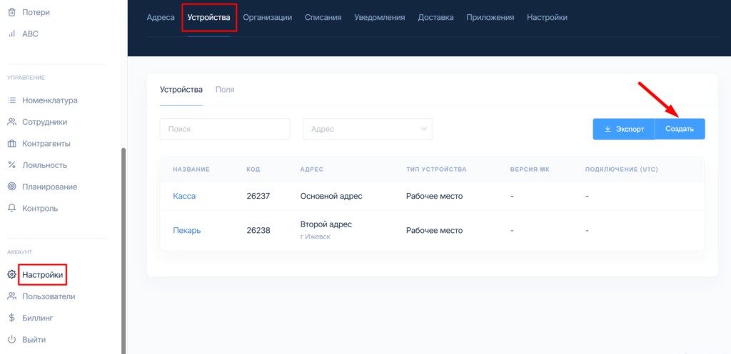 После установки модулей-ячеек умной выдачи в столешницу, нужно привязять их в личном кабинете Мой кассир. Перейдите в личном кабинете в меню Настройки, вкладка Устройства и кликните кнопку Создать.