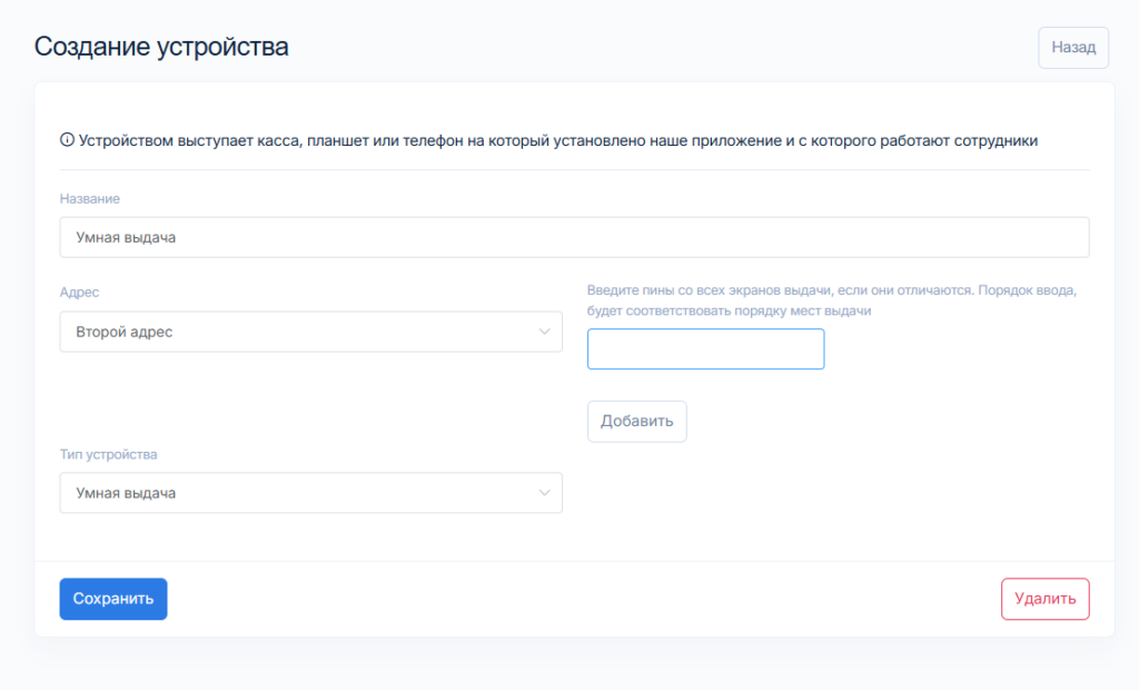 Укажите Название устройства и Адрес точки, на которой будет установлена Умная выдача. Тип устройства — Умная выдача.