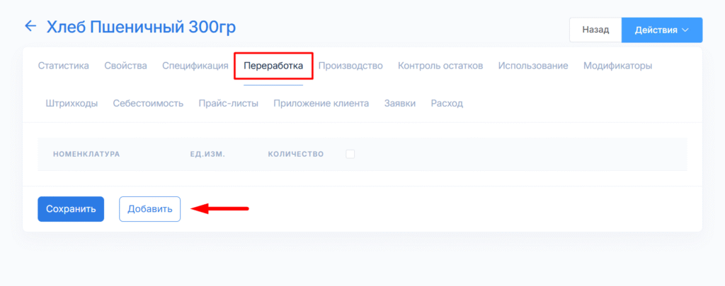 Провалитесь в выбранную позицию, перейдите во вкладку Переработка и нажмите кнопку Добавить.