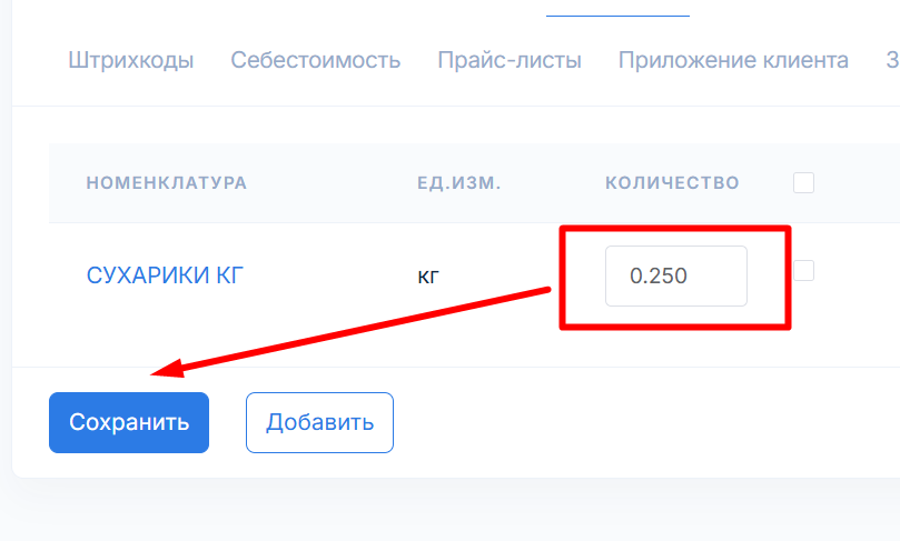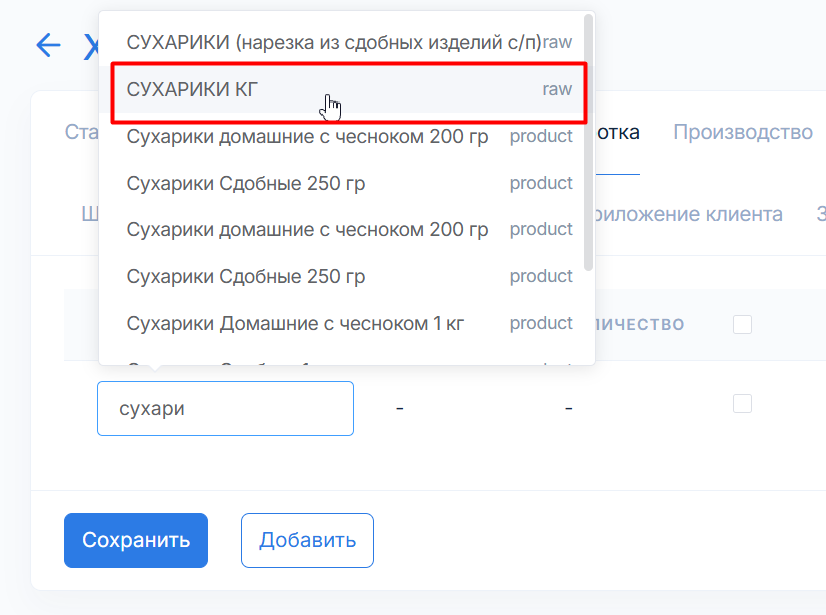 В появившемся поле Укажите ингредиент пропишите позицию, которую получите после переработки. Обратите внимание, что при переработке получается весовое сырье или полуфабрикат.