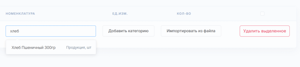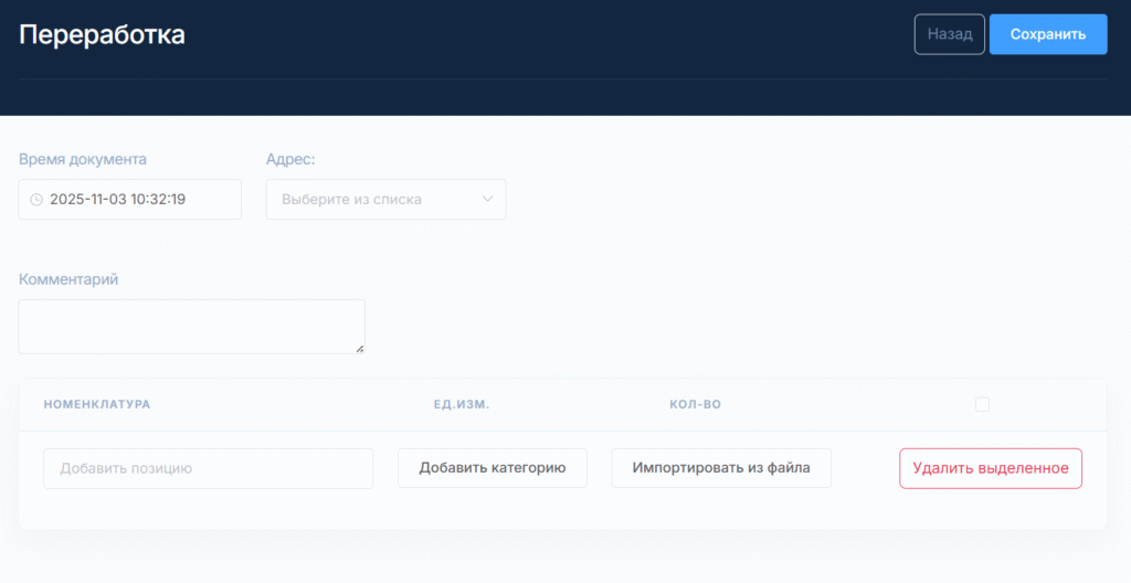 Далее заполните продукцию, которую перерабатываете. Для добавления доступны только те позиции, на которые назначены правила переработки.