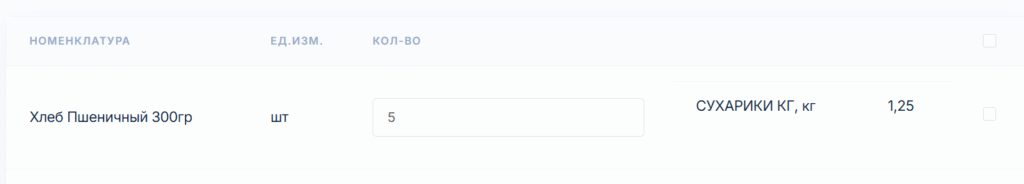 Готово. Правило переработки занесено. Теперь при переработке Хлеба пшеничного 300г на остатке будут появляться весовые сухари. Из каждой буханки 250 г сухариков.