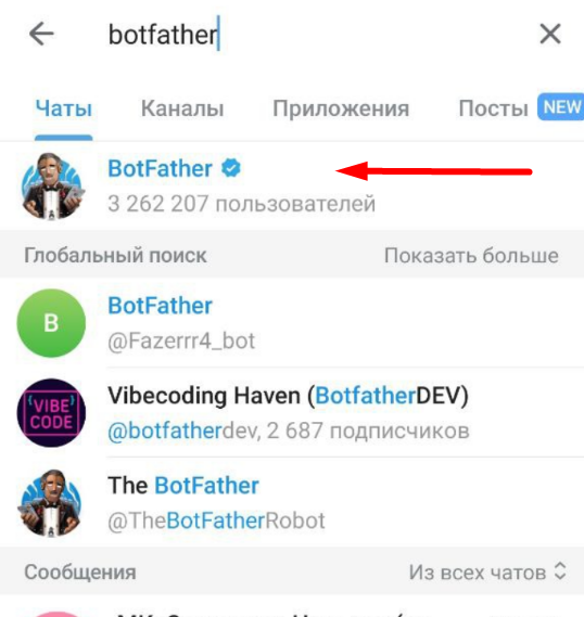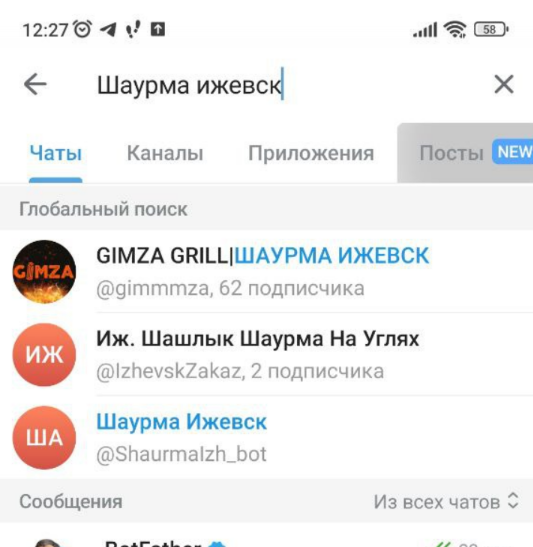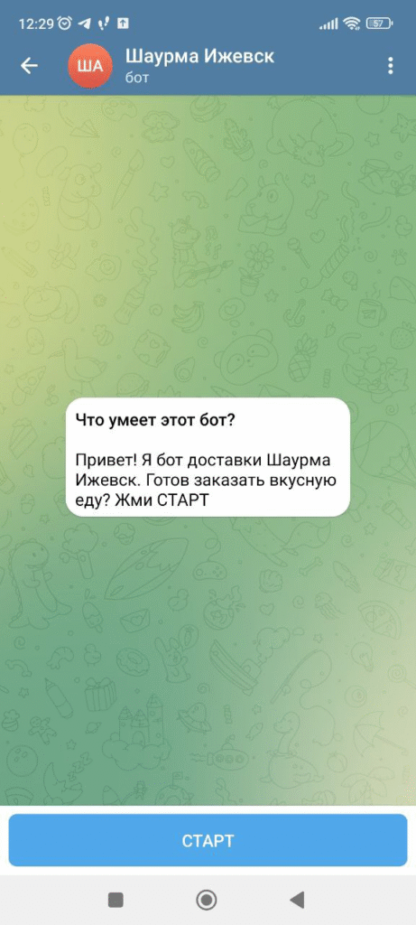 В поисковой строке укажите название бота, кликните на появившийся в списке бот и нажмите кнопку Старт.