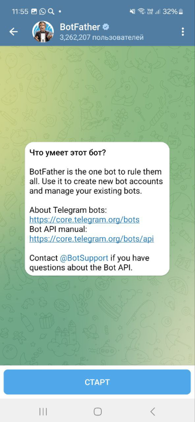 2. Нажимаем кнопку Старт или вводим команду /help, чтобы ознакомиться с возможностями