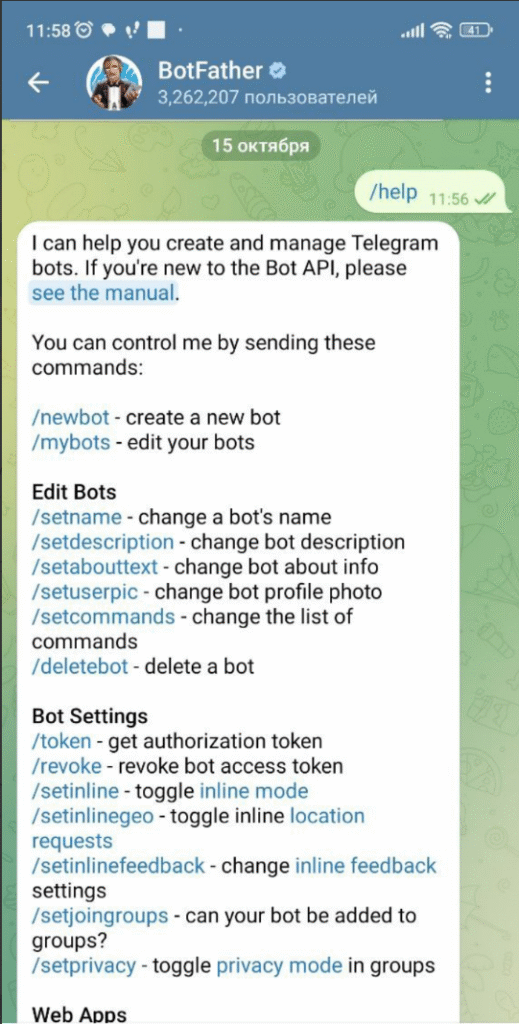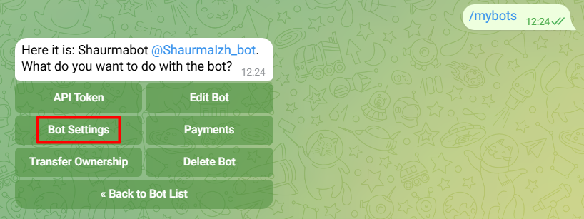 Введите команду /mybots и выберите из списка ботов только что созданный. Далее кликните на команду Bot Settings.