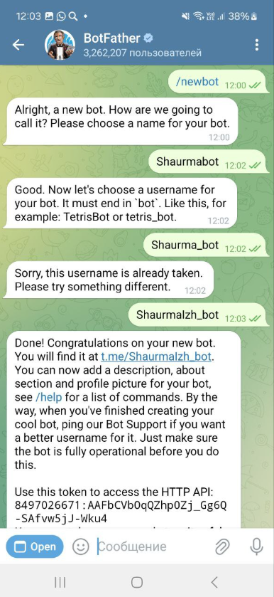После сохранения система автоматически создаст ссылку для привязки приложения в настройках созданного телеграм-бота. Копируйте ссылку и вернитесь в @BotFather.