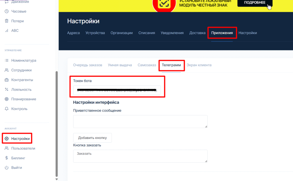 Зайдите в личный кабинет, меню Настройки, вкладка Приложения, вкладка Телеграмм. И вставьте токен в поле Токен бота и нажмите Сохранить.