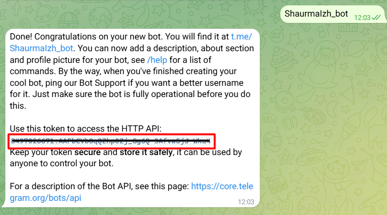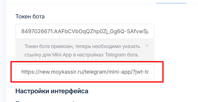 Чтобы привязать созданный бот к аккаунту в Мой кассир, копируйте строку с токеном.