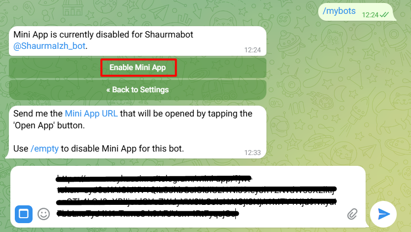 Выберите команду Configure Mini App. Далее кликните на команду Enable Mini App. Вставьте и отправьте скопированную ссылку.