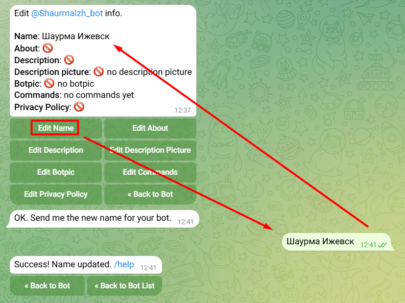 Edit Name — изменить название, то что будет отображаться в шапке бота;