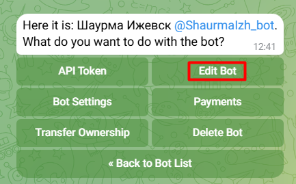 Кликните на команду Back to Bot и выберите команду Edit Bot.