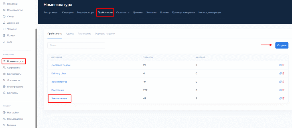- Создать прайслист с доступным к заказу ассортиментом и ценами через меню Номенклатура, вкладку Прайслисты. Подробнее о создании прайслистов.