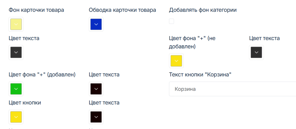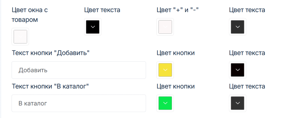 - Цвет фона «+» (не добавлен) и цвет текста — цвет кнопки для добавления товара в заказ и цвет текста в этой кнопке;
