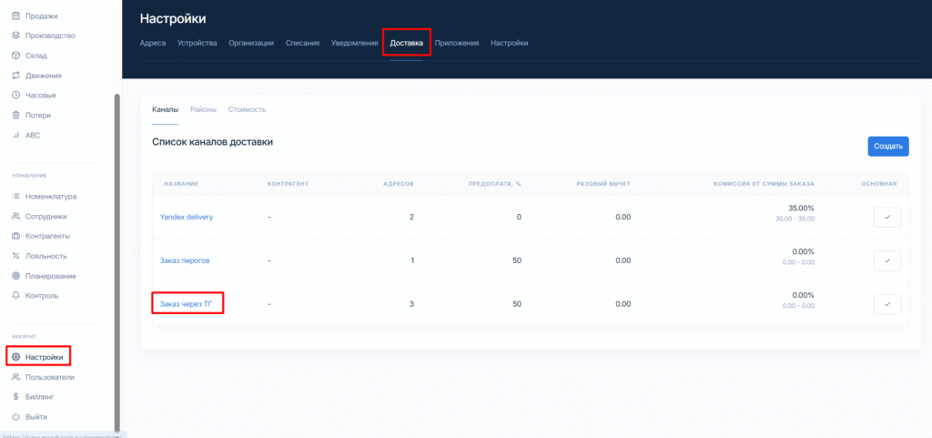 2. Завести отдельный канал доставки в меню Настройки, вкладка Доставка. Подробнее о создании каналов доставки.