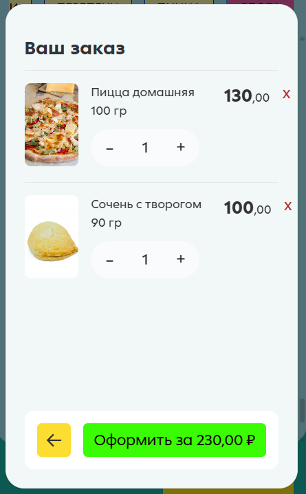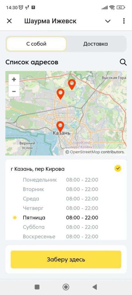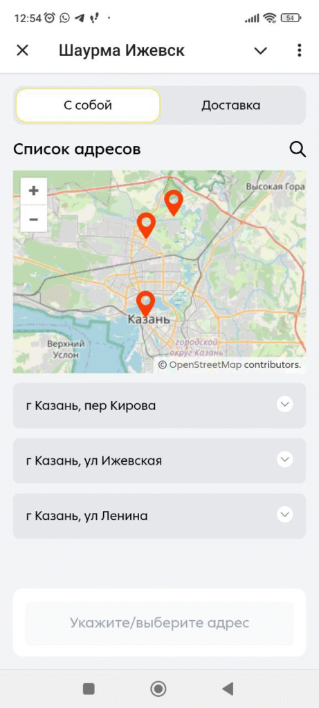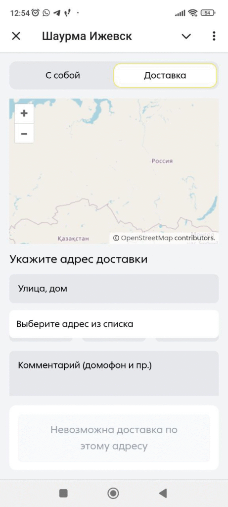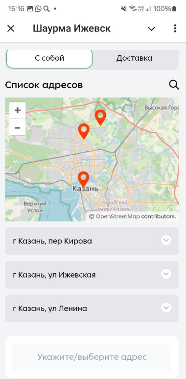 Заказ доступен в двух вариантах — оформить самовывоз в одном из доступных заведений или заказать доставку до указанного адреса.