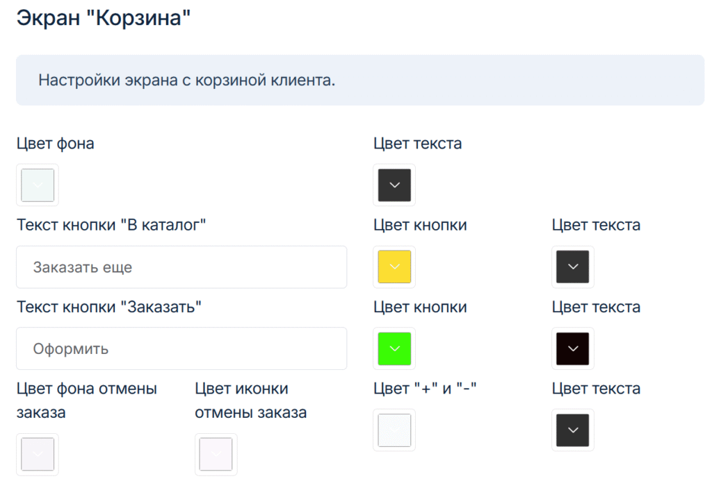 - Цвет фона отмены заказа — цвет кнопки для удаления товара из корзины;