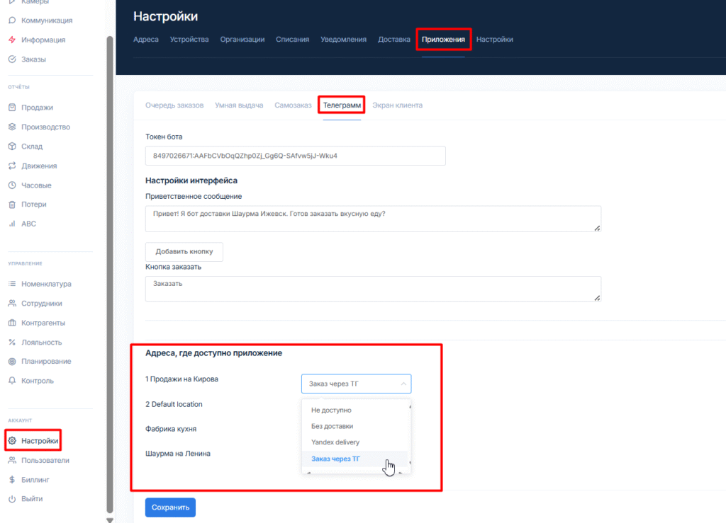 3. Привязать канал доставки к адресам в настройках работы с ботом через меню Настройки, вкладку Приложения, вкладку Телеграмм.