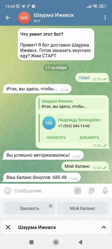 Авторизуется пользователь один раз. Все последующие заказы сразу привязаны по номеру телефона к его бонусному балансу.