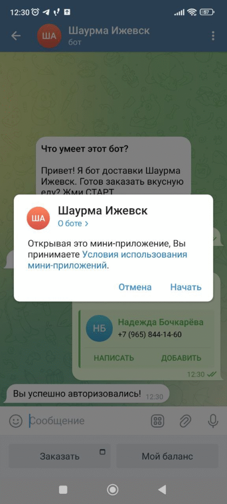 Нажимая Начать пользователь автоматически соглашается с Условиями мини-приложений телеграмм.