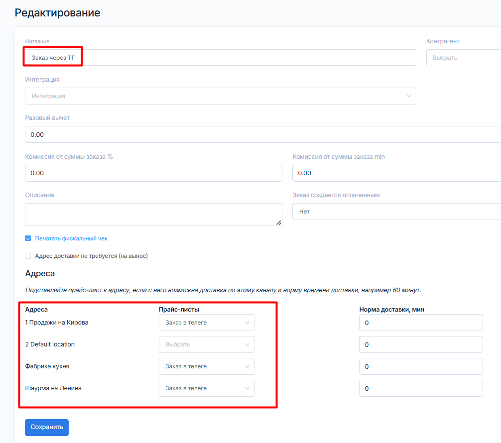 Чтобы при заказе через телеграм-бот отображался ассортимент и цены необходимо привязать канал доставки к адресу. Для этого нужно: