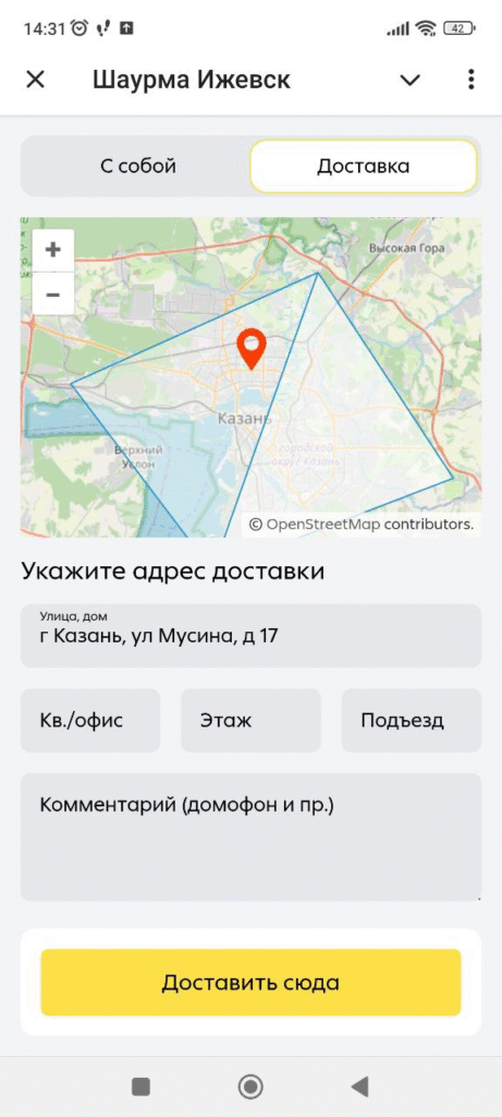 Чтобы заказать доставку до адреса, перейдите в раздел Доставка. Укажите точку на карте или наберите адрес в соответствующем поле. Далее нажмите кнопку Доставить сюда.