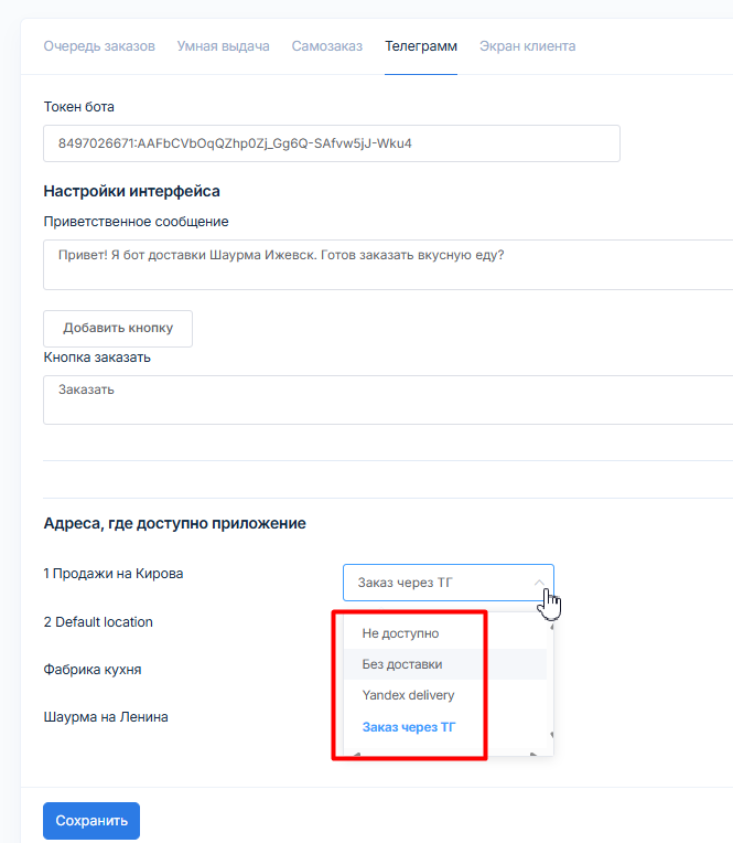 После привязки каналов доставки к адресам, они будут доступны для оформления заказа через телеграм-бот.