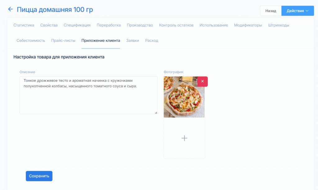 - зайдите в меню Номенклатура, кликните на название нужной позиции и перейдите во вкладку Приложение клиента;