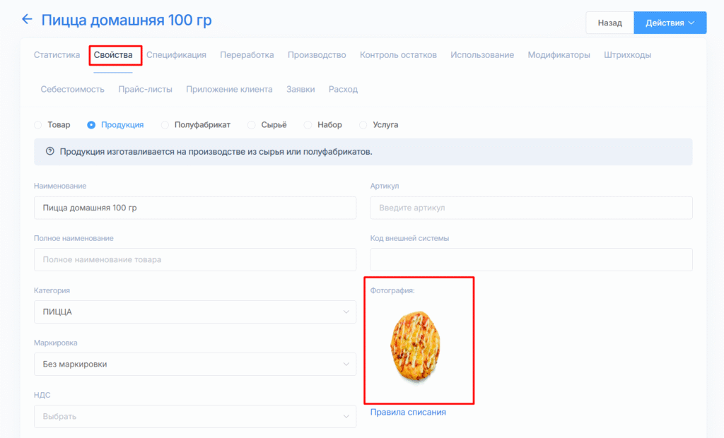 Фото во вкладке Свойствах призвано облегчить работу сотрудников. Продукция изображена крупно, чтобы с одного взгляда можно было отличить ее от другой, похожей выпечки. Акцент на особенностях внешнего вида: защипы, форма, размер.