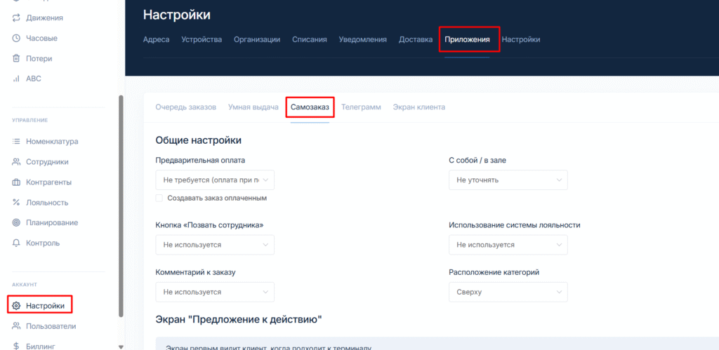 Чтобы настроить цветовое решение телеграм-бота перейдите в меню Настройки, вкладка Приложения, вкладка Самозаказ.